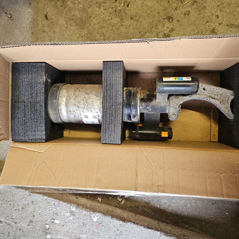 Ventilblokken er demontert fra en Tesla Model X 2020 raven. Årsaken til byttet var fukt i luftfjæringssystemet. Den er fullt fungerende, men krever fjerning av fuktighet/rens innvendig.