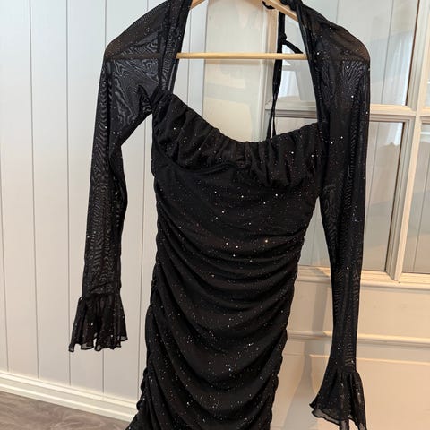 Shein festkjole for dame i størrelse S. Kjolen er rød og laget i polyester. Modellen har kort erm, dyp v-utringning og knyting foran. Skjørtet er drapert med rynkedetaljer og volangkant nederst. Passer til fest og andre anledninger der man ønsker en enkel, figurnær kjole.