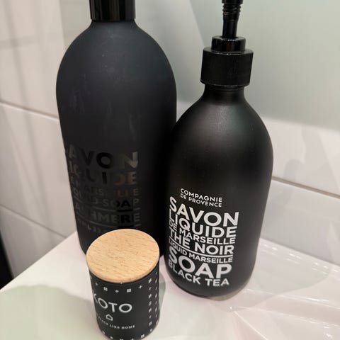 Alle delene er pent brukt og uten feil eller mangler. Såpedispenserne har avtrykk etter klistrelapper på siden. Disse synes ikke ved vanlig bruk, og kan nok vaskes vekk (jeg har ikke prøvd)