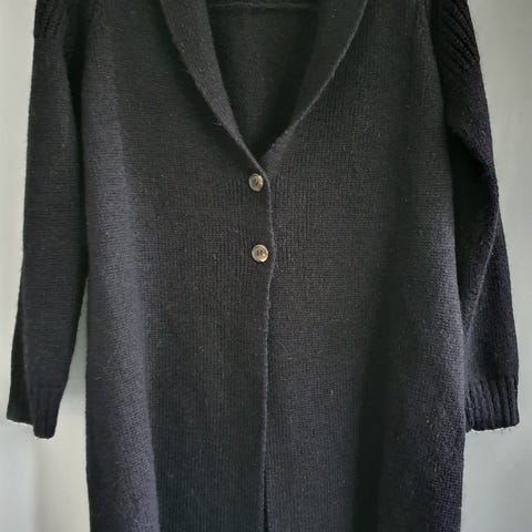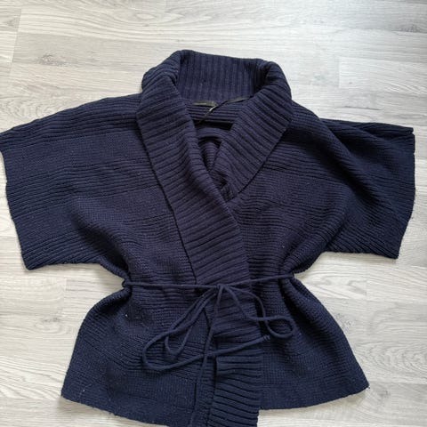 Tiger of Sweden Sada genser for dame i størrelse S. Genseren er blå og strikket i en myk blanding av syntetiske og naturfibre (se vaskelapp for nøyaktig sammensetning). Modellen har løs passform, ribbestrikket sjalskrage og dobbelspent knappelukking foran med fire knapper. Lengden går ned over hofter, og ermene er noe forkortet med lett droppede skuldre. Egner seg godt som et ekstra lag over topp eller kjole i hverdagen. Eller som ekstra varme i påskesola. Har lommer i sidene. Kan brukes som tunika. Rekker nedenfor rumpe.