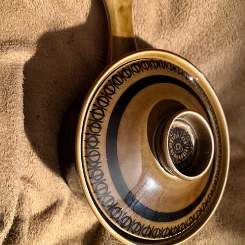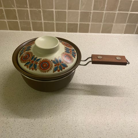Figgjo Astrid flammefast kasserolle i keramikk med tilhørende lokk. Dekor Astrid i flerfarget blomstermønster. Kasserollen er merket "Norge Figgjo Flameware Decor Astrid in Vulcanus Quality for gas and electricity" og er egnet til bruk på både gass og elektrisk komfyr. Håndtak i tre og metall. Passer til tilberedning og servering av varme retter.