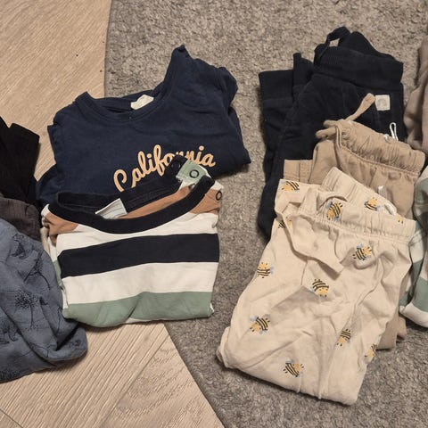 Forskjellige barneklær sett i størrelse 86. Pakken består av ulike plagg i flere farger, blant annet gensere, bukser og joggedresser. Klærne er egnet til hverdagsbruk for barn størrelse 86. Inneholder 8 sett, 1 strikket sett, 3 ull sett og en ull body.