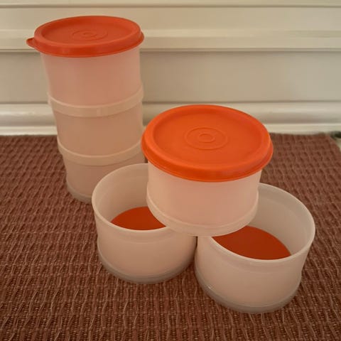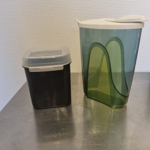 Tupperware plastbokser med lokk i ulike farger. Rund form, egnet til oppbevaring av matvarer på kjøkkenet, som tørrvarer, rester eller snacks. Boksene har tilhørende plastlokk som kan settes tett på for å beskytte innholdet. Kan brukes både i skap, skuffer eller på benk for organisert oppbevaring.