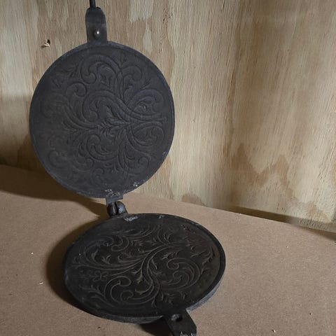 Gammelt krumkakejern. Ukjent opprinnelse. Har de siste årene hengt til pynt på en hyttevegg. Godt brukt/slitt (se bilder) Vekt: ca 2.3 kg