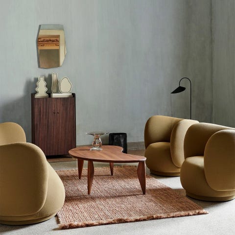 Det største bordet SK15 har mål ø90cm h 48cm, det minste SK14 har mål ø60cm h 40cm.