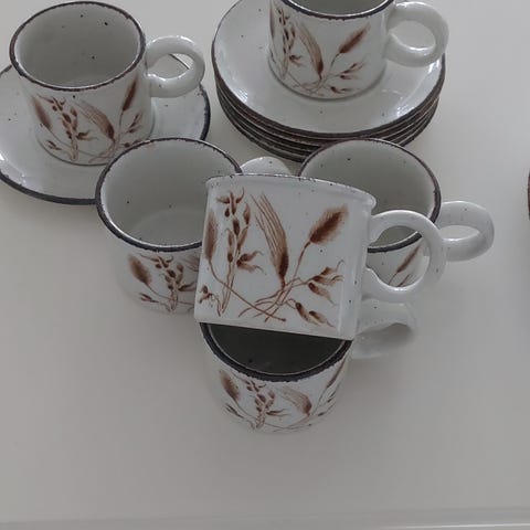 8 kaffekopper med fløtesett og to ekstra underskåler fra Stonehenge, Midwinter. Dekoren heter Creation- lansert i 1972. Tross alder er disse tidløse med sitt enkle rustikke uttrykk. Perfekte kaffekopper. Alle delene er feilfrie. Selges samlet.