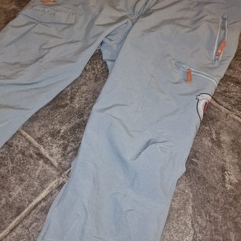 Twentyfour Finse turbukse for dame i størrelse 38. Buksen er tofarget i ulike blåtoner. Den har elastisk linning bak, beltehemper og knappelukking foran. Det er glidelåslomme i siden og forsterkede felt på knær og nederst på bena. Egnet som turbukse til friluftsliv og hverdagsbruk utendørs. Aldri brukt.