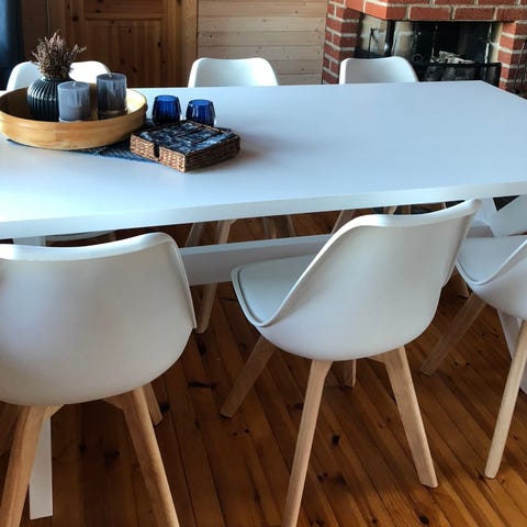 Enda en sjarmerende spisegruppe i butikken! Spisebordet er et stil rent hvit, og stolene i en kul oransje farge. Se så fete!