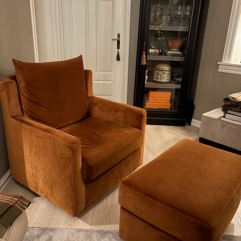 Pent brukt stor lenestol fra Home Factory i grønt velur stoff. Puff med oppbevaring følger med stolen. Må hentes