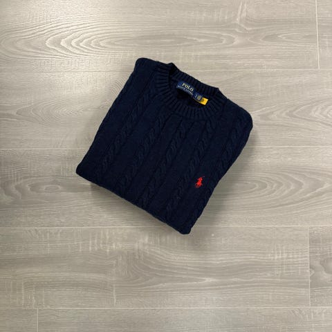 Ralph Lauren genser for herre i størrelse M. Genseren er svart og strikket i ull med flettestruktur. Den har rund hals og ribbestrikkede kanter. Diskré logo brodert på brystet. Passer til hverdagsbruk og kan kombineres med både jeans og chinos