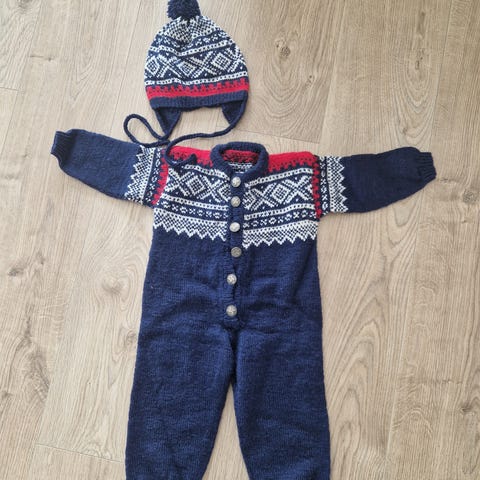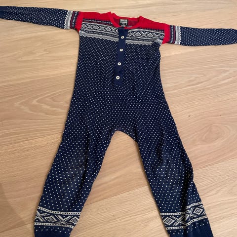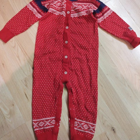 Den er rød med mønster i kontrastfarge og har knapper foran samt langs bena for enkel av- og påkledning. Passer godt som kosedress eller som varm innerdress på kjølige dager.
