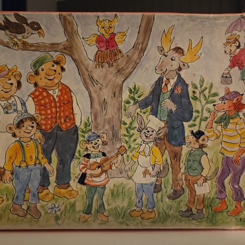 Motivet viser Klatremus og flere av dyrene samlet ute i skogen.