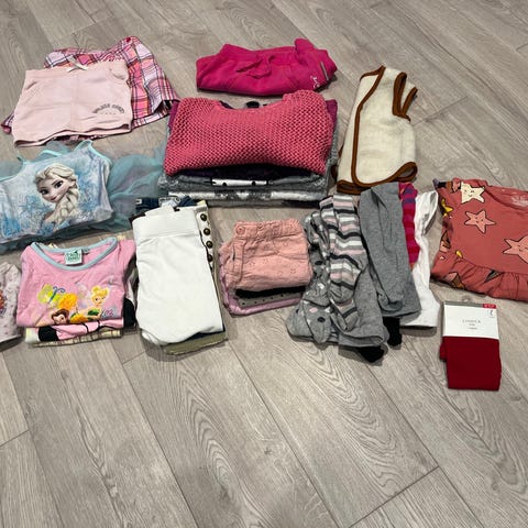 Selger diverse klær i str 98/104. Klærne selges samlet som en klespakke. Noen plagg er mer brukt enn andre. Andre plagg fremstår som nytt. Flekker og andre bruksmerker kan forekomme (se bilder) og klærne er merket med navn etter bruk i barnehage. Fine klær med mye bruk igjen. Merker som newbie, KappAhl, H&M og Cubus. Selges for 500kr + frakt