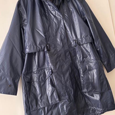 Jakken er svart og laget i bomullsmateriale med vannavvisende overflate. Modellen har lang lengde, lange ermer og belte i livet for justering av passform. Lukkes med knapper foran og har lommer i sidene.