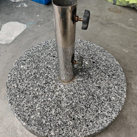 Parasollfot i stein med metallrør. Foten har åttekantet form og er laget av mørk stein med innfelt stjernemønster på oversiden. Metallrøret i midten har justerbare skruer for å feste parasollstangen. Undersiden har sentrert hull for feste av røret. Egnet som base for parasoll på terrasse eller i hage, der det er behov for en stabil og tung fot.