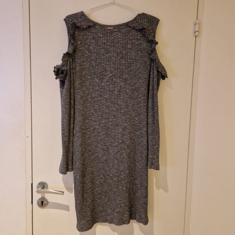 Guess ribbestrikket kjole for dame i størrelse L. Kjolen er beige og laget i viskose. Den har tettsittende passform med vertikale ribbestriper som gir struktur i stoffet. Lange ermer og v-utringning. Egnet som hverdags- eller penkjole avhengig av styling.
