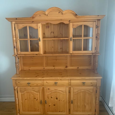 Skjenk med 2 skap, 2 store skuffer og 8 små skuffer. B 185 cm. H 83 cm. D 45 cm. Heltre furu fra 70 tallet. Må hentes. Pris 1000kr.