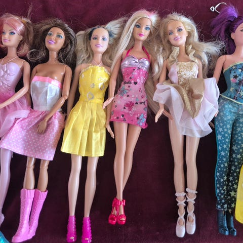 Barbie dukker sett med flere dukker i ulike antrekk. Dukkene har forskjellige hårfarger og klær, blant annet kjoler og bukser i ulike farger. Passer som lekedukker for barn som liker rollelek og utkledning med Barbie-figurer. Klærne kan tas av og byttes mellom dukkene etter ønske.
