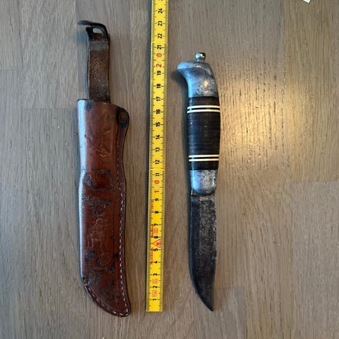 Turkniv med slire. Kniven har blad på rundt 10 cm og total lengde på omtrent 20 cm. Håndtaket er laget av ben kombinert med tre og metallring. Medfølgende slire er i lær med hempe for feste i belte. Egnet som turkniv eller brukskniv til friluftsliv og enkel skjæring ute.Geilo