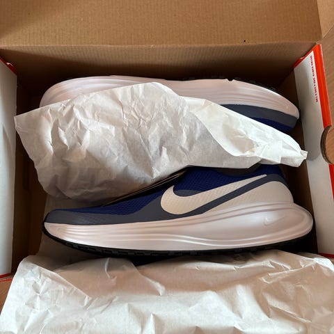 Nike Revolution løpesko i størrelse 43. Skoene er i svart med hvit såle og hvit Nike-logo. Overdelen er i pustende mesh-materiale med snøring foran. Yttersålen har mønster for grep ved løping på asfalt og lignende underlag. Egnet som løpesko eller til annen lett trening og hverdagsbruk.