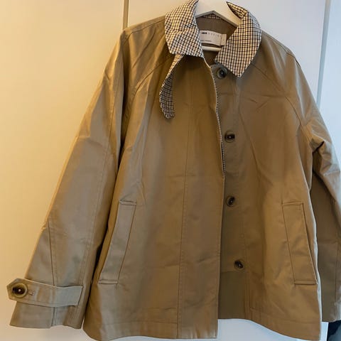 Jakken er mørkgrønn (blir lysere på bilde) med mørk kontrastkrage og vide ermer.