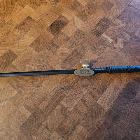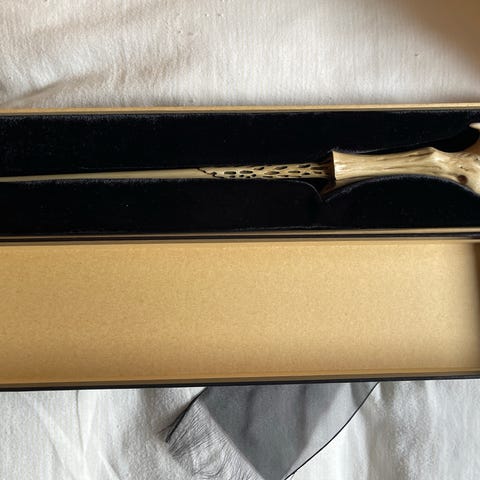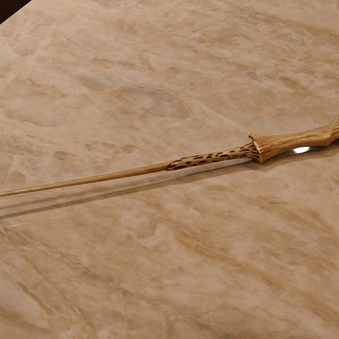 Voldemorts tryllestav i ukjent materiale. Kjennes ut som lakkert treverk eller hardplast, har litt tyngde. Har også Severus Snapes tryllestav som kan legges ved for 100 kr ekstra.