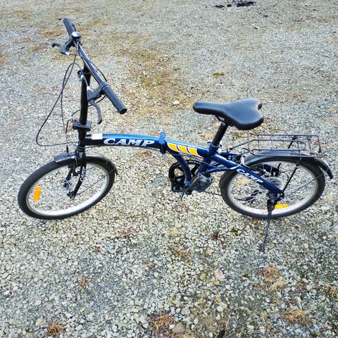 Fikk den som gave men den har aldri blitt brukt. Den ene dekk er litt flatt nå, men det skyldes kun lagring – den trenger bare å pumpes opp.