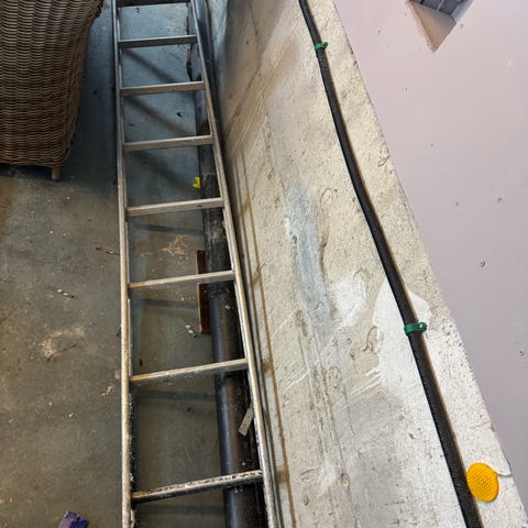 Gardintrapp, arbeidslampe, skjørtekabel og hammer