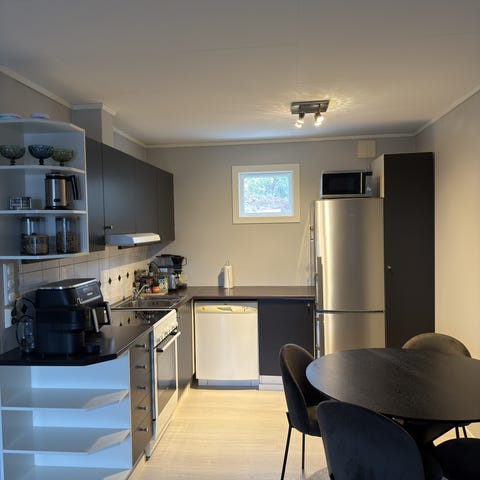 Alle hvitevarer fungerer som det skal. Nyere oppvaskmaskin og kjøleskap (ca 3-4 år). Eldre platetopp og komfyr, men alt fungerer.