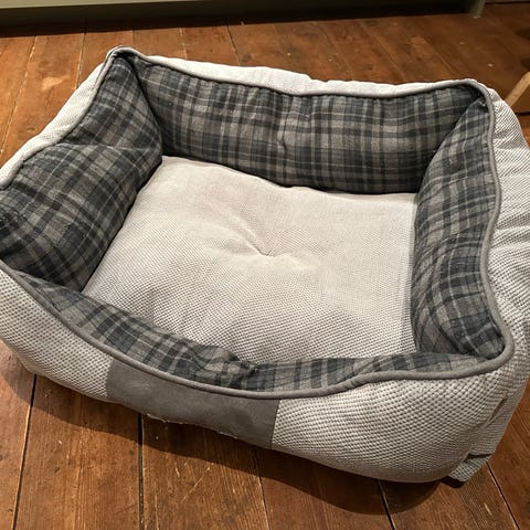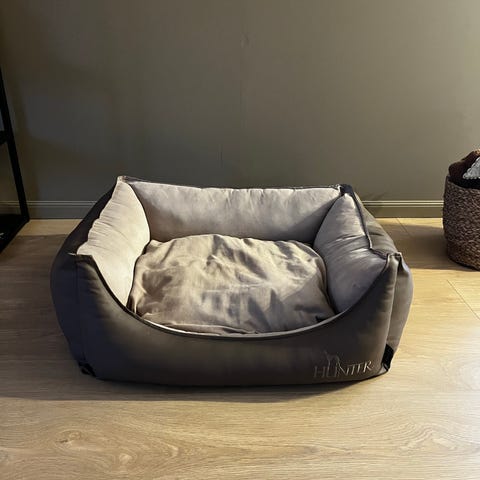 Hundeseng i grønn tekstil. Sengen har myke, polstrede kanter og en løs pute i bunnen for økt komfort. Passer til små til mellomstore hunder, avhengig av mål. På én av kantene er det en synlig rift i stoffet som fremgår av bildene.