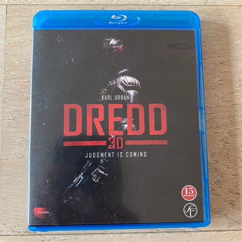 Action- og science fiction-film utgitt på Blu-ray i 3D-versjon. Omslaget viser at utgaven inneholder filmen «Dredd» i 3D-format, med aldersgrense 18 år. Disken kan spilles av på kompatible Blu-ray-spillere som støtter 3D. Egner seg for samlere eller for de som ønsker filmen i fysisk Blu-ray-format.
