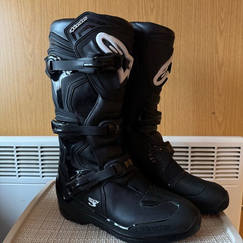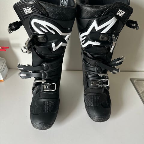 Str, 45 .Alpinestars motocrossstøvler i svart med røde og hvite detaljer. Støvlene har høy skaftkonstruksjon med flere justerbare spenner foran. Kraftig såle med mønster for godt grep. Egnet for bruk til motocross eller annen offroad motorsykkelkjøring. Nærmere modellbetegnelse og størrelse er ikke oppgitt og bør kontrolleres mot merking i støvlene.