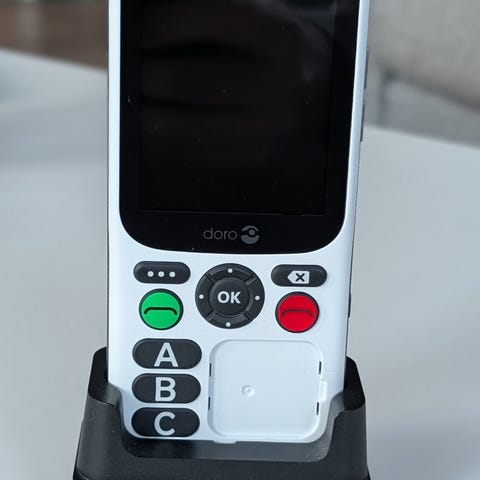 Enkel å bruke med store knapper og skjerm med tydelige og lettleste ikoner. Fin for de som synes smarttelefon er vanskelig å bruke. Ladestasjon, kabel og øreplugg medfølger.