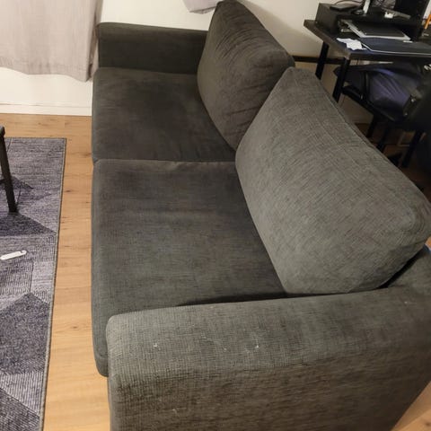 Lett å gjøre om til sovesofa, med mål 2x2 meter. Solide og faste puter og madrass.