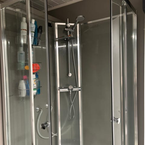 Dusjkabinett med integrert badekar i hvit utførelse. Kabinettet har skyvedører i glass og innebygget panel med hånddusj, flere justerbare dyser og betjeningsknapper. Det er sittekant i karet og hyller til oppbevaring av såpe og andre baderomsartikler. Behov for grundig rengjøring, da den er veldig støvete, og gammel såperester og div. Fungerer greit + radio i dusjen, ikke dab trur jeg. Akkurat kjøpt bolig, ikke utvasket. Har ikke flere opplysninger om den. Hentes på slettaelva, først til mølla. Blir kastet neste uke.
