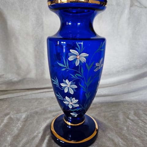 Blå dekorativ vase med lokk i blåfarget glass med håndmalt blomsterdekor og gulldetaljer. Vasen har klassisk, slank form med rund fot og lokk med toppknott. Egner seg som pyntegjenstand på gulv eller større overflater i stue, gang eller andre oppholdsrom. Høyde 47 cm med lokk.