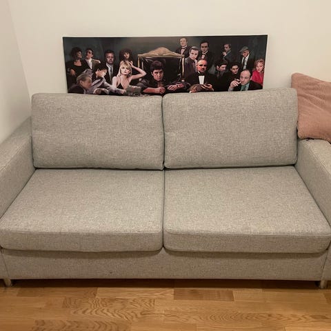 Sovesofa Juvre fra Jysk i lysgrå. 3-seters sofa med stofftrekk. Sofaen omgjøres enkelt til seng. Sete- og ryggputer i skum. Ben i massivt tre. Liggemål 116x192 cm. B192 x H89 x D92 cm