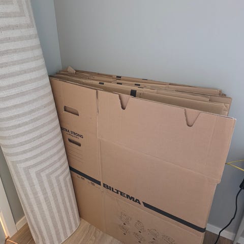 Tingstad flytteesker i papp i brun farge. Eskene leveres flatpakket og er beregnet for flytting, lagring eller transport av innbo og annet gods. Standard flyttekasser med håndtak på sidene for enklere bæring. Antall og eksakte mål er ikke spesifisert i annonsen.
