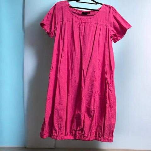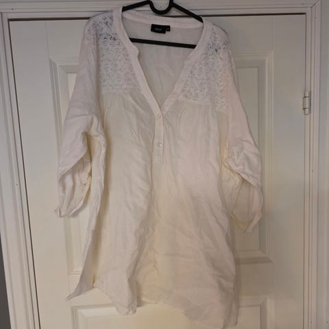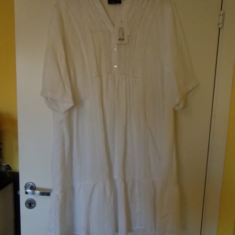 Zizzi sommerkjole for dame i hvit farge. Kjolen er i viskose 85% og polyester 15%. Noe usikker på str, da den er kjøpt på Finn og merkelapp var revet av. Den er mindre enn L, kanskje M eller S. Størrelsen som er målt fra underarm til underarm er ca 58 cm. Den har v-hals med knappelukking foran og dekorative blondedetaljer langs brystpartiet og foran på overdelen. Ermene er ca. 3/4-lange med løs passform. Kjolen har lett rynking under bysten som gir en rett og komfortabel fasong. Passer som enkel sommerkjole eller tunika over bukse eller tights.