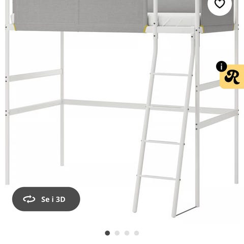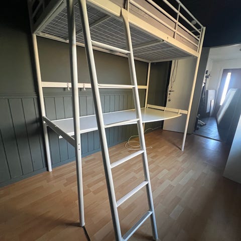 IKEA loftseng med integrert skrivebord i hvit utførelse. Sengen står høyt, med stige på siden for adkomst til liggeflaten. Under sengen er det et fastmontert skrivebord som gir arbeids- og oppbevaringsplass. Rammen er i metall med rekkverk rundt overkøya. Passer på barnerom, ungdomsrom eller andre rom der man ønsker å utnytte plassen under sengen til skrive- eller hobbyområde. Stigen kunne trengt et lag med maling ,men ellers veldig fin seng, madrass kan følge med om dere ønsker, man trenger heller ikke montere pult om dere trenger ekstra plass under .