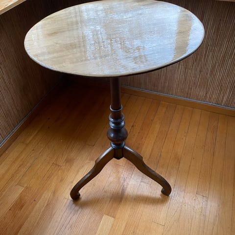 Lite rundt sidebord i tre med dreid søylefot og tre utskårne ben. Bordplaten har bølget kant og innfelt dekor på overflaten. Passer som sidebord ved sofa eller stol, eller som lite avlastningsbord i stue, gang eller soverom.
