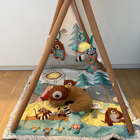 Babygym med mykt leketeppe og skogmotiv. Teppe med dyrefigurer, trær og elv i lyse og varme farger.