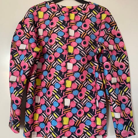 Munthe bluse str 42 spraglete . Vidde 55 cm, lengde 54 cm. En ekstra knapp.