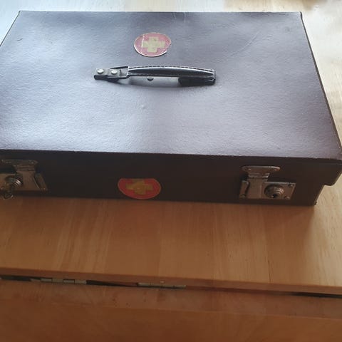 Bærbar manuell skrivemaskin med integrert koffert for oppbevaring og transport. Maskinen har grønt kabinett og grønne taster med hvit skrift. Kofferten har bærehåndtak og metall-låser. Det følger med et beskyttelsestrekk i matchende grønnfarge.
