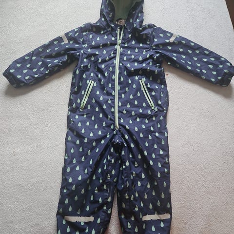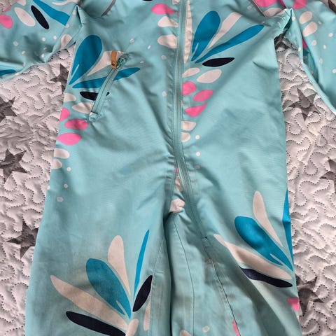 Den har hette, lang glidelås foran for enkel av- og påkledning, samt elastikk fotstrikk nederst på bena for å holde bena på plass. Den bør byttes ut snart.