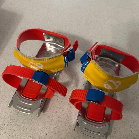 Justerbare barneskøyter med metallkonstruksjon og blå plastreimer. Skøytene festes utenpå sko ved hjelp av justerbare stropper og spenner. Lengden kan reguleres for å passe ulike skostørrelser (markert 24–31 på undersiden). Egnet for barn som vil prøve skøyter på is, for lek og enkel bruk på islagte flater.