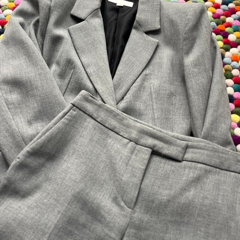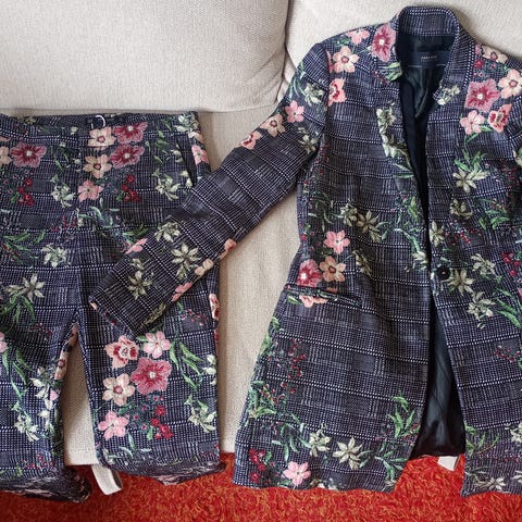 Zara dressbukse og blazer for dame i størrelse M. Sett i ensfarget blå. Blazeren har enkel knepping foran, slag og klaffelommer. Buksen er smal 7/8 lengd. Passer til bruk som dress eller hver for seg til både hverdags- og penere anledninger.
