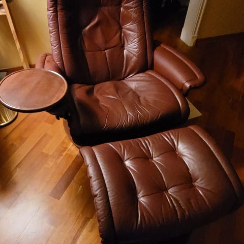 Stolen er fin og hel unntatt armlene som er litt løst bak på det ene armlene. Derfor den selges billig. Stolen fungerer fortsatt perfekt og lett å fikse for en som er litt handy (ikke meg hehe)