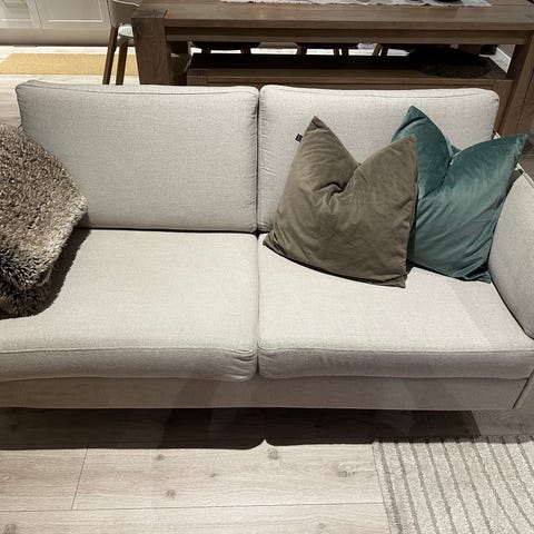 Selger en pen og solid 2-seters sofa i tidløst design. Sofaen har rette, moderne linjer, brede armlener og komfortable puter som gir god sittekomfort.