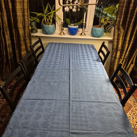 Sølv/grå duk i polyester (velur-lignande tekstur). 240 cm x 140 cm.